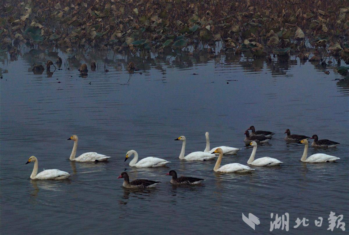 11月19日一早,湖北省当阳市季家湖的晨雾渐渐消散,一群小天鹅在湖面上翩翩起舞,为水面增添了生机。这已经是天鹅连续第六年按计划抵达这里,并以石家湖作为越冬地。