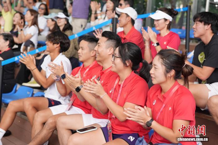 11月15日,在广东珠海举行的第十五届全国女子双打网球锦标赛首轮比赛中,王康怡、张伟焕组合的香港队以2比0战胜对手,晋级下一轮。图为香港队教练组及球员观看比赛。图片提供:中新网记者、杨华峰。